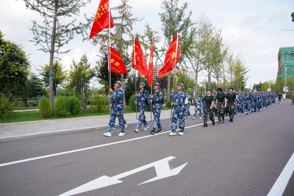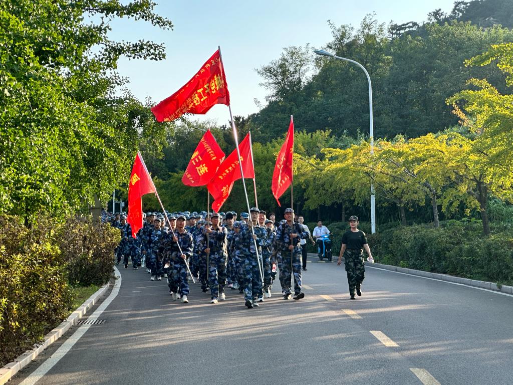 三点整,随着教官一声嘹亮的“出发!”,征程正式拉开帷幕。行进途中,同学们步伐铿锵有力,彼此扶持、相互鼓劲,队列始终整齐有序。教官们适时组织大家高唱军歌,嘹亮的歌声在校园小径上回荡,既振奋了士气,又传递着青春的蓬勃力量,成为校园里一道动人的风景线。